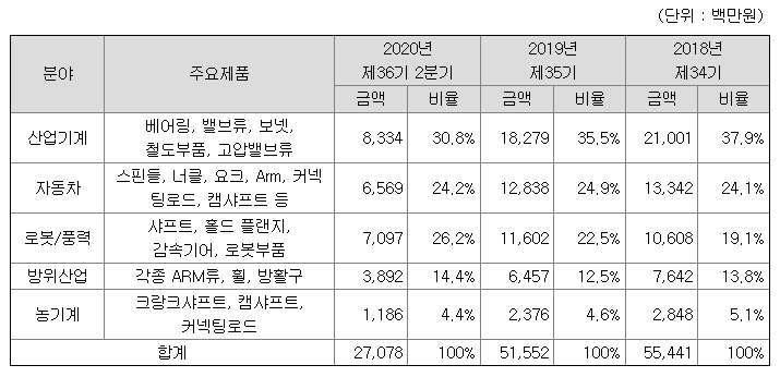 산업기계쪽에 베어링, 밸브류,철도부품,보넷 등이 높은 비중을 차지하고 있으며 로봇, 풍력 제품인 샤프트, 홀드 플랜지, 감속기어, 로봇부품이 전년대비 비율이 조금 늘어난 상태다. 그 다음으로 자동차분야에 스핀들, 너클, 요크 ,arm, 커넥팅로드, 캠샤프트 등의 제품이 24.2%의 비율을 차지 하고 있다. 그 밖에 방위산업분야, 농기계에 단조 제품들이 매출의 나머지를 차지한다.