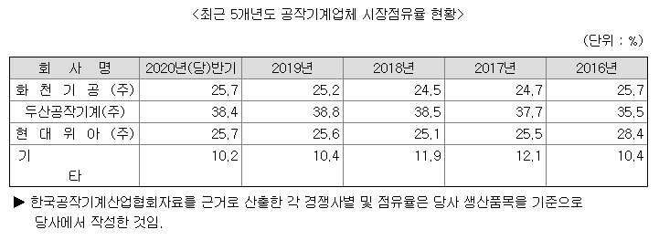 한국공작기계산업협회의 자료를 보면 최근 5개년도 공작기계 업체의 시장점유율 현황은 아래와 같다.