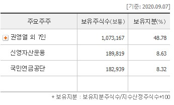 주주구성을 보면 권영열 대표이사가 있고 외 7인이 48.78% 지분을 가진것으로 나타난다. 그외 신영자산운용과 국민연금공단이 보유하고 있다.