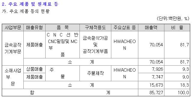 주요제품은 금속공작기계가 81% 비중을 차지 하고 주물이 나머지를 구성한다.