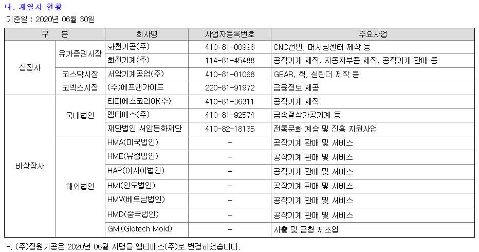 계열사 현황을 보면 유가증권시장 코스피에 상장된 화천기공이 공작기계를 만들고 화천기계가 이를 판매하고 있다.