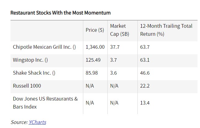 다우존스 US레스토랑스&바스지수로 대표되는 외식업종이 더 넓은 시장을 밑돌았다. 이 지수는 러셀 1000의 총 수익률이 12월 8.2일 현재 22.2%인 것에 비해 1년 뒤진 13.4%를 기록했지만, 배달이나 테이크아웃이 성공적인 레스토랑은 이 기간 동안 특히 양호한 성과를 보였다. 그것은 아래의 요식업종 상위주식에 반영되어 있다.