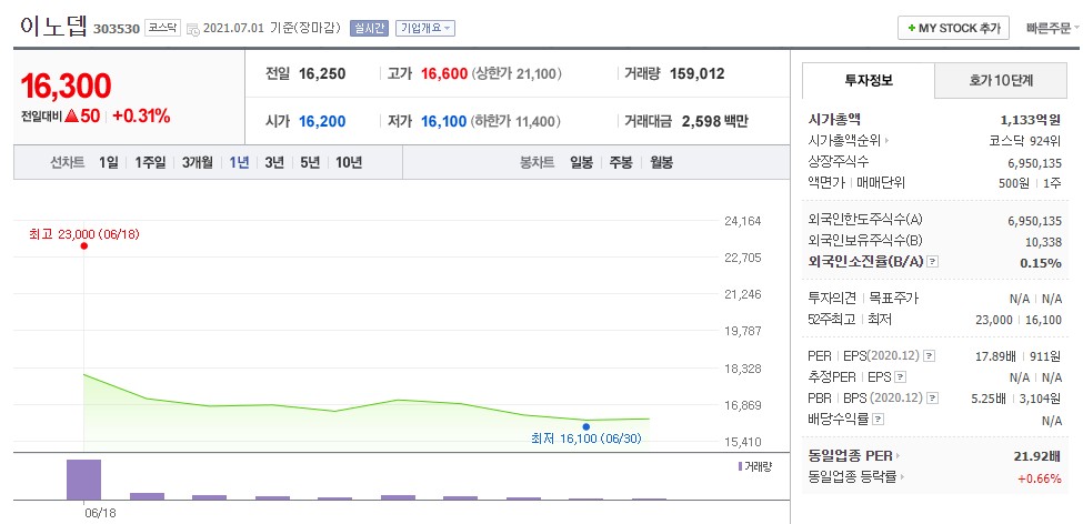 21년 6월 22일 상장한 따끈따끈한 이노뎁에 대해서 살펴보도록 합니다. 시가총액은 1,133억원, 상장주식수는 6,950,135주로 다소 적어보이고 공모가액은 18,000원 기준 23,000원을 터치하고 16,300원으로 주저앉았다. 최근에는 7월 1일자로 주식매수선택권을 행사 공시가 나왔고 유통물량은 점점 늘어날것으로 보인다.