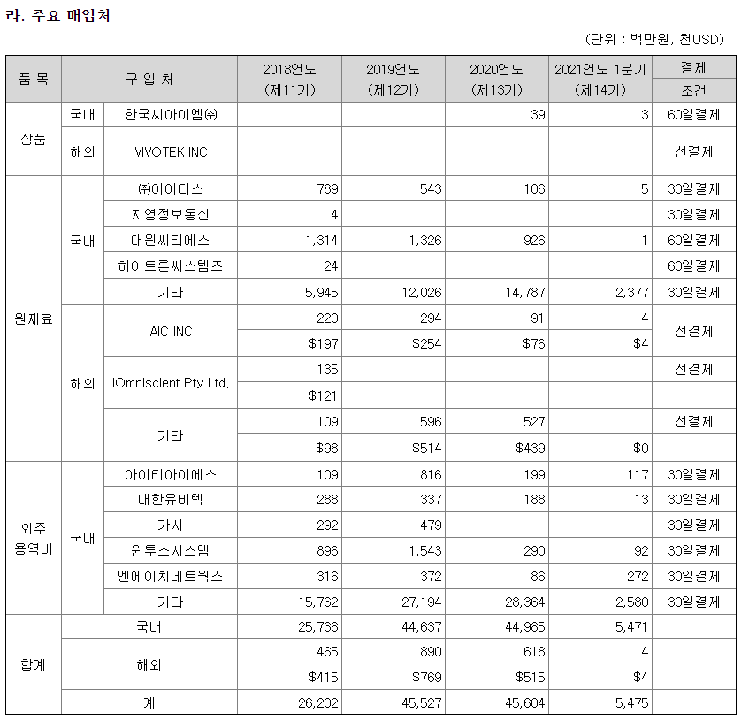 주요매입처로는 상품과 원재로, 외주용역비가 사용되고 제조시설이나 생산시설은 따로 없기 때문에 인건비 보다 연구개발활동에 더욱 치중을 하여야 하는 지식형 기업에 가깝다고 볼수있다.