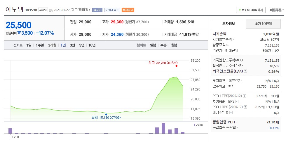 이노댑 관련글을 처음 쓴 시각이 21년 7월 1일 경인것을 감안하면 주가는 많이 오른상태다. 현재 32,750원을 찍고 25,000원 부근에서 하락세가 이어지고 있다.