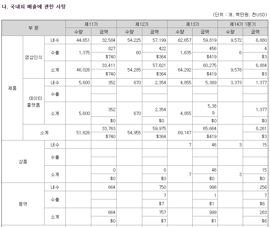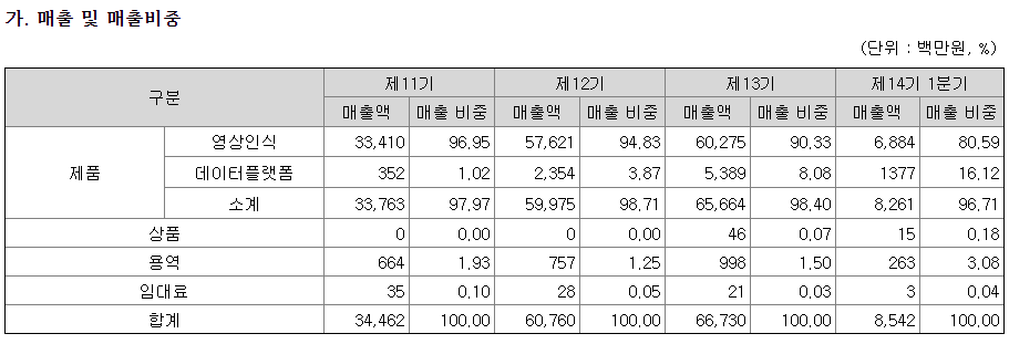 매출비중의 치중은 눈여겨 봐야할 부분이며 S/W 특성상 데이터플랫폼의 점유율이 계속될지는 소프트웨어의 성능에 달렸다고 볼수있다.