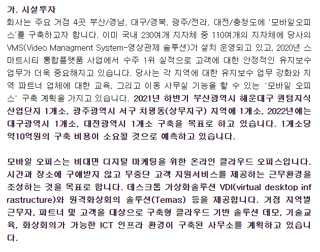 모바일 오피스는 비대면 디지털 마케팅을 위한 온라인 클라우드 오피스이다라고 정의한다. 이미 국내 230여개 지차체중에 110여개의 지자체에 VMS(영상관제 솔루션)이 설치 운영되고 있다고 한다.
