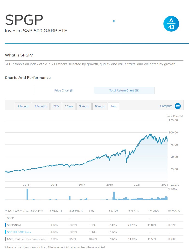 SPGP seeks growth stocks that also contain quality and value traits, or growth at a reasonable price. Starting from the S&P 500, the underlying index selects 150 names with the highest growth score, derived from trailing 3-year earnings to price growth and sales to price growth. It then picks the top half of these based on a quality and value score, using financial leverage ratio, return on equity and earnings to price. The resulting 75 names are weighted by the growth score. The underlying index undergoes semi-annual rebalance and reconstitution, subject to certain constraints. The maximum weight of each security is 5% while the maximum weight of any given GICS sector is 40%. Prior to June 24, 2019, the fund tracked a Russell pure growth index (perhaps the opposite of GARP in growth context) under a different name and ticker (PXLG).
