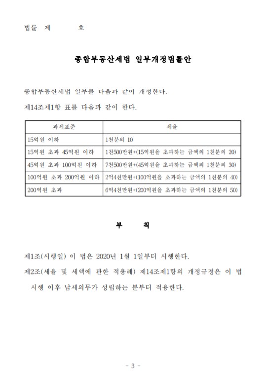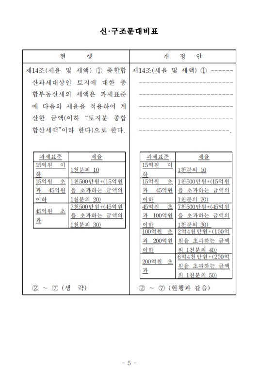 이에 주로 경제적 기여도가 떨어지는 비사업용 토지 등 종합합산과세대상이 되는 토지에 대한 세율의 상한을 상향함으로써(100억원 초과 3%→4%, 200억원 초과 3%→5%), 부동산 투기를 제한하고 편중된 토지 소유 구조를 완화하려는 것임(안 제14조제1항).