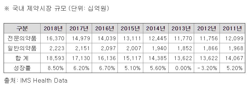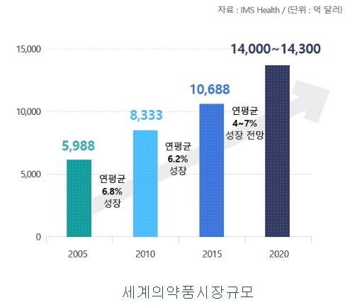 1조달러(약1,200조원 ,2015년 기준)로 추산되는 세계 의약품시장은 인구 고령화 등 의약품 수요증가로 2005년 이후 연평균 6%대에 성장세를 유지, 앞으로도 연평균 4~7%의 성장속도를 보이며 2020년에는 1,650조에 달할 전망.