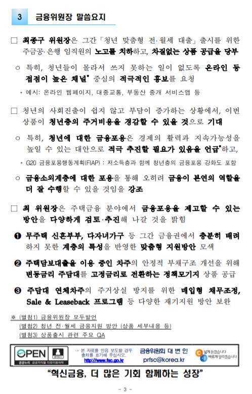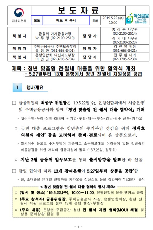 □ 금융위원회 최종구 위원장은 ’19.5.22일(수), 은행연합회에서 시중은행* 및 주택금융공사와 함께「청년 맞춤형 전 월세 대출 협약식」개최 * NH 국민 우리 신한·KEB하나 기업 수협 대구 부산 경남·광주·전북 카카오 ㅇ 금번 대출 프로그램은 청년층의 주거부담 경감을 위해 정재호 의원의 제안* 등을 고려하여 준비 검토되어 온 상품으로서, * 월세거주 등으로 주거부담이 과중하고 소득확보에도 어려움이 있는 청년층의 비용경감을 위한 저리의 금융지원이 필요 (‘18.7.25일, 정무위) ㅇ 지난 3월 금융위 업무보고를 통해 출시방향을 발표한 바 있음