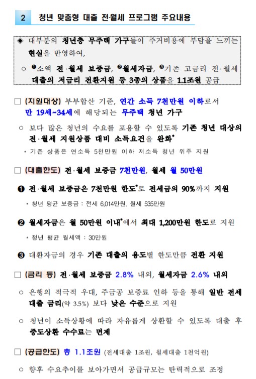□ (지원대상) 부부합산 기준, 연간 소득 7천만원 이하로서 만 19세~34세에 해당되는 무주택 청년 가구 ㅇ 보다 많은 청년의 수요를 포용할 수 있도록 기존 청년 대상의 전 월세 지원상품 대비 소득요건을 완화* * 기존 상품은 연소득 5천만원 이하 저소득 청년 위주 지원 □ (대출한도) 전 월세 보증금 7천만원, 월세 월 50만원 ➊ 전 월세 보증금은 7천만원 한도*로 전세금의 90%까지 지원 * 청년 평균 보증금 : 전세 6,014만원, 월세 535만원 ➋ 월세자금은 월 50만원 이내*에서 최대 1,200만원 한도로 지원 * 청년 평균 월세액 : 30만원 ➌ 대환자금의 경우 기존 대출의 용도별 한도만큼 전환 지원 □ (금리 등) 전 월세 보증금 2.8% 내외, 월세자금 2.6% 내외 ㅇ 은행의 적극적 우대, 주금공 보증료 인하 등을 통해 일반 전세 대출 금리(약 3.5%) 보다 낮은 수준으로 지원 ㅇ 청년이 소득상황에 따라 자유롭게 상환할 수 있도록 대출 후 중도상환 수수료는 면제 □ (공급한도) 총 1.1조원 (전세대출 1조원, 월세대출 1천억원) ㅇ 향후 수요추이를 보아가면서 공급규모는 탄력적으로 조정