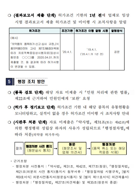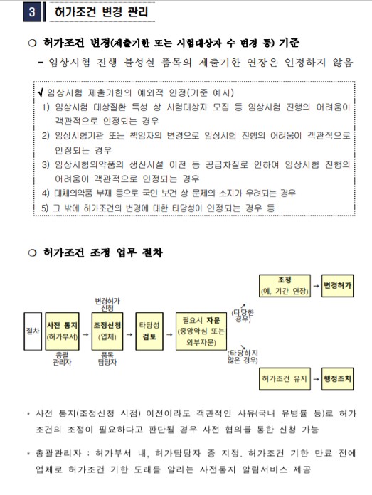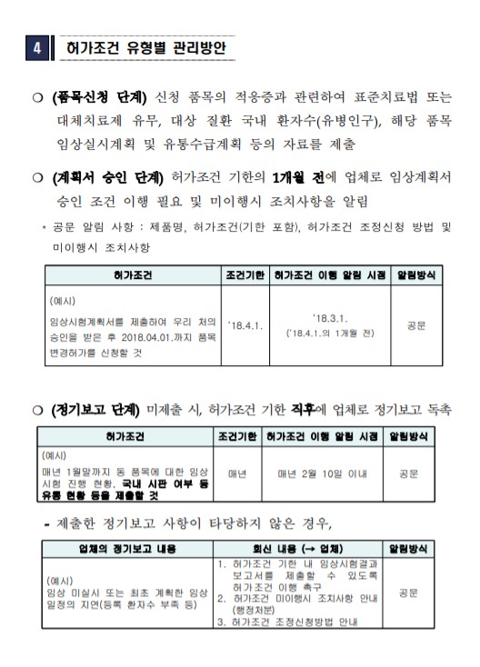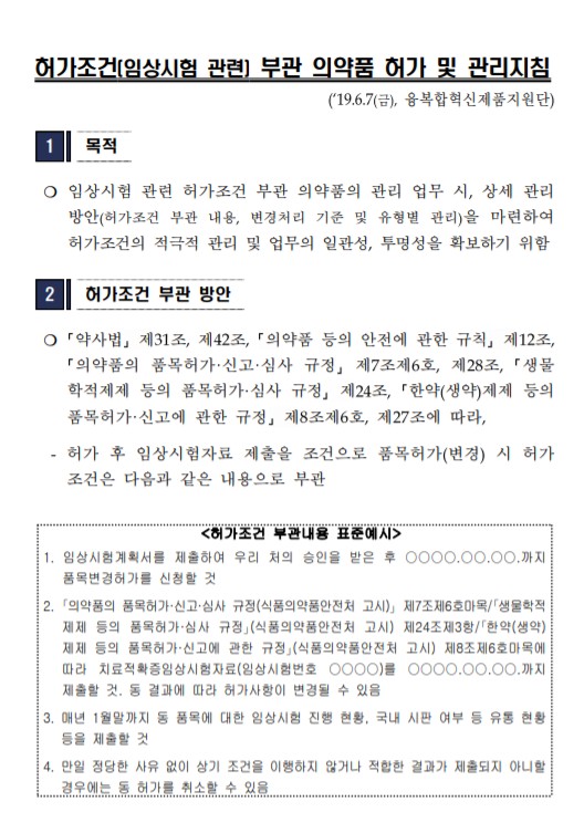 식품의약품안전처에서는 항암제 등 생명을 위협하는 희귀한 질환이나 긴박한 상황에 적용되는 3상 임상시험 조건부 허가 품목에 대한 적정 관리를 위하여 '허가조건 부관 의약품 허가 및 관리 지침'을 붙임과 같이 개정하였음을 알려드리니 업무에 참고하시기 바랍니다.