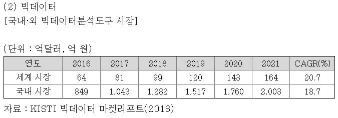빅데이터시장의 경우 세계시장은 143억달러(17조 8,035억 원)로 연성장율은 20.7%이며, 국내시장은 1,282억 수준이다.