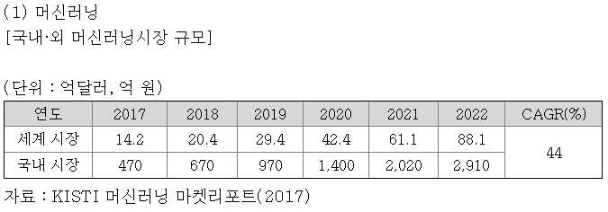 머신러닝의 시장은 다음과 같이 세계시장은 20년 기준 42.4억달러(5조 2,788억 원)에 이르고 국내시장은 1,400억수준에 머무르고 있으며 연성장율은 44%에 이른다.