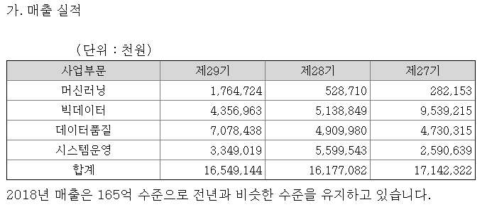 당사의 머신러닝 사업은 2015년부터 꾸준한 연구와 국책과제 수행 등을 통하여 자체 솔루션 및 기술을 확보하였습니다. 그 결과 다양한 산업에서 머신러닝을 적용한 사례를 기반으로 최근 머신러닝 사업에서 강점을 보이고 있습니다. 특히 신성장 분야에서의 사업은 경험이 있는 업체가 적어 사업 수주가 용이할 것으로 판단되고 있습니다.