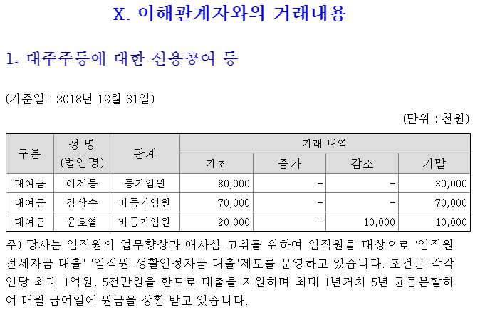 당사는 임직원의 업무향상과 애사심 고취를 위하여 임직원을 대상으로 '임직원 전세자금 대출' '임직원 생활안정자금 대출'제도를 운영하고 있습니다. 조건은 각각 인당 최대 1억원, 5천만원을 한도로 대출을 지원하며 최대 1년거치 5년 균등분할하여 매월 급여일에 원금을 상환 받고 있습니다.