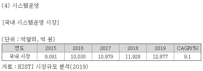 시스템운영시장은 19년 기준 국내 12,877억 수준으로 연평균성장율은 9.1%에 달한다.