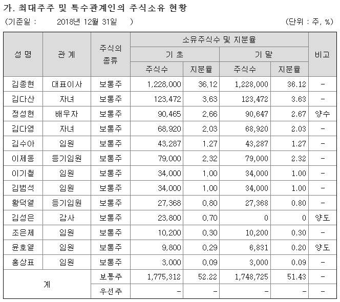 주주구성은 아래와 같고 최대주주는 김종현 대표로 36.12%의 지분을 보유하고 있다.