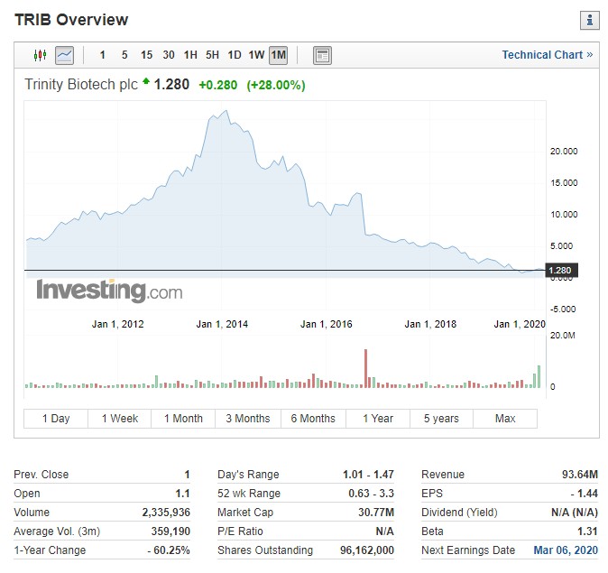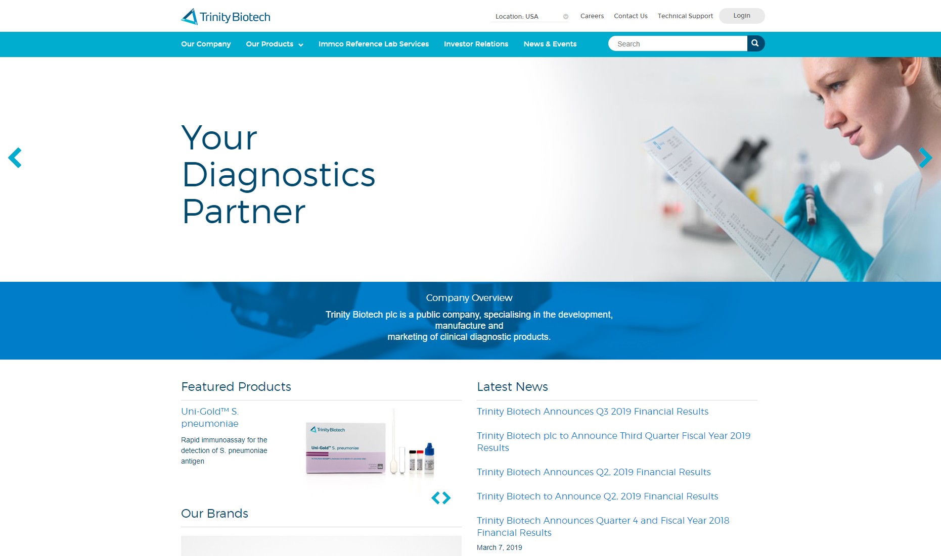 Trinity Biotech plc (Trinity Biotech)는 진단 시장의 임상 실험실 및 POC (point-of-care) 부문을위한 의료 진단 제품을 개발, 획득, 제조 및 판매합니다. 이 회사의 제품은자가 면역, 전염성 및 성병, 간장 및 장의 장애를 탐지하는 데 사용됩니다. 그것은 아메리카와 세계의 두 부분으로 운영됩니다. 제품은 POC, 응급 의학, 임상 실험실 및 혈액 은행 선별로 분류됩니다. POC 브랜드로는 Uni-Gold와 Recombigen이 있습니다. 응급 의료 진단은 급성 치료 테스트, STAT 실험실, 수술 전 / 후 수술실, 의사 사무실 실험실 및 중앙 실험실을 말합니다. Trinity Biotech는 임상 화학 사업을 통해 시약 제품 및 기타 제품을 임상 실험실 시장에 공급합니다. Trinity Biotech의 혈액 은행 스크리닝 사업부는 수혈 가능한 감염을 위해 기증 된 혈액을 선별하는 제품을 제조합니다.