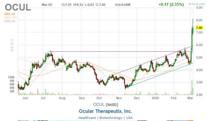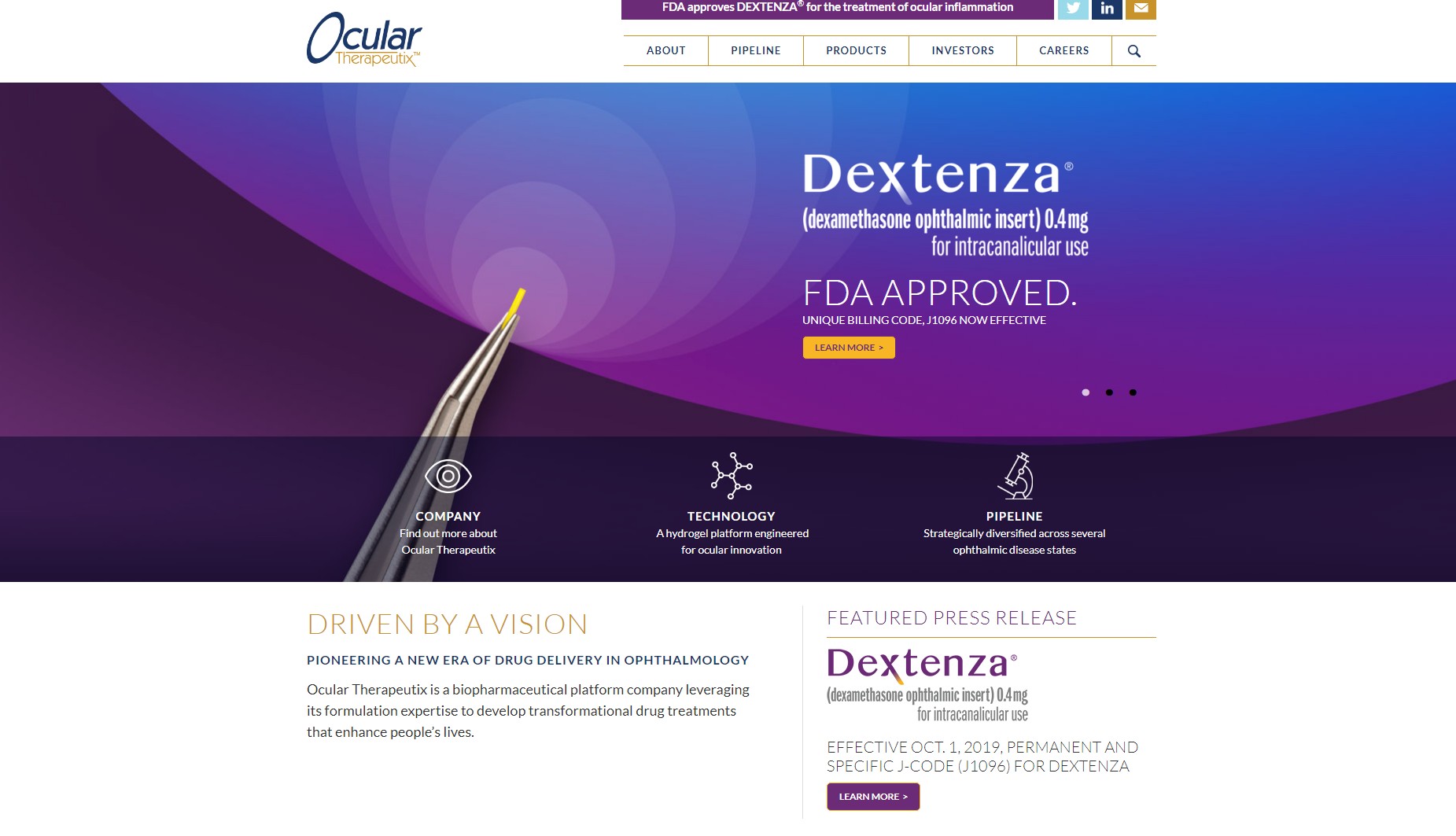 Ocular Therapeutix, Inc.는 독점적 인 하이드로 겔 플랫폼 기술을 사용하여 눈의 질병 및 상태에 대한 치료법의 개발, 제조 및 상용화에 중점을 둔 생물 제약 회사입니다. 주요 치료제 후보자 인 DEXTENZA (dexamethasone insert)는 정맥 내 사용으로 안과 수술 후 안구 통증 및 염증 치료를위한 III 상 임상 개발을 완료했습니다. OTX-TP (travoprost insert)는 녹내장과 안구 고혈압의 3 상 임상 개발 중입니다. 초기 단계 자산에는 OTX-TIC, 중등도 내지 중증 녹내장 및 안구 고혈압의 치료를위한 서방 성 트라 보 프로스트 카메라 내 주사뿐만 아니라 망막 질환 치료를위한 서방 성 유리 체내 주사가 포함된다. 이 주사에는 티로신 키나제 억제제 인 OTX-TKI의 개발이 포함되며 Regeneron과 공동으로 서방 형 단백질 기반 항 혈관 내피 성장 인자 트랩