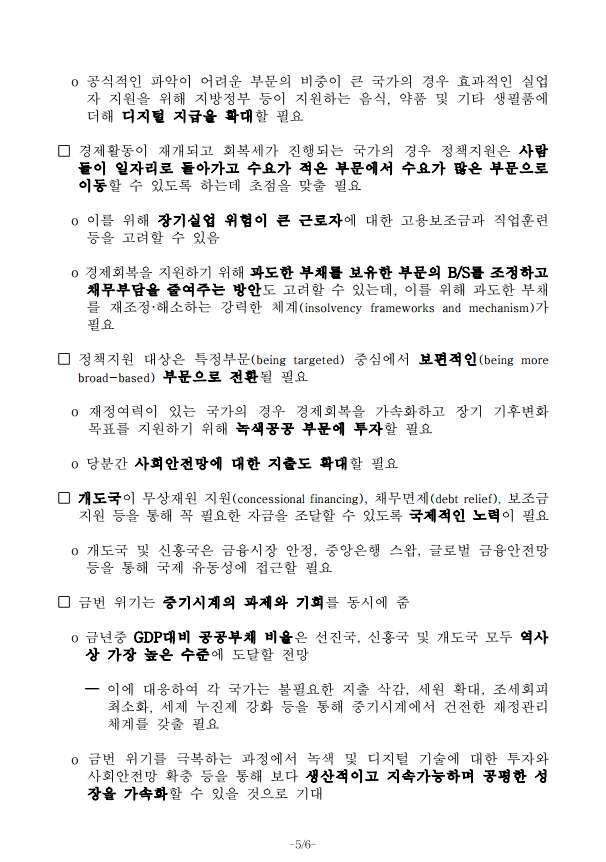 o 금번 위기를 극복하는 과정에서 녹색 및 디지털 기술에 대한 투자와