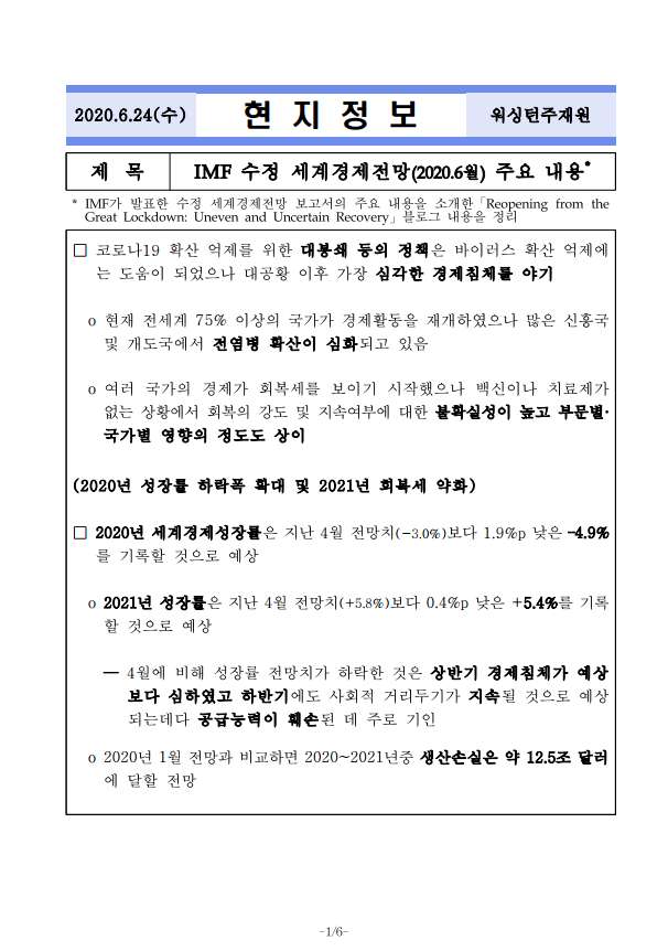 □ 2020년 세계경제성장률은 지난 4월 전망치(-3.0%)보다 1.9%p 낮은 –4.9%