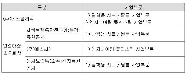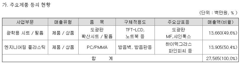 사업부문으로는 크게 광학용시트와 필름 그리고 엔지니어링 플라스틱 사업을 하고 있다. 엔지니어링 플라스틱의 경우 국내시장기준 시장점유율은 60% 추산하고 있다.