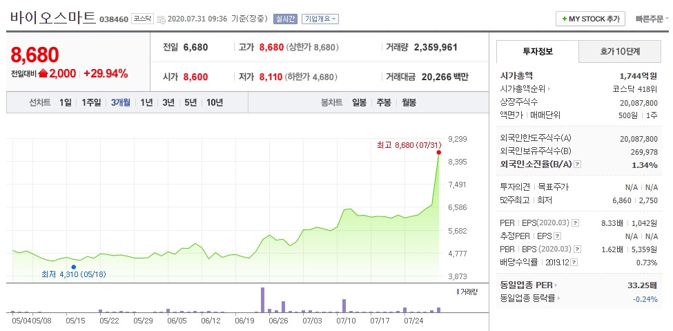 일주일전 바이오스마트의 코로나19 1시간 진단키트가 식약처의 승인을 받았다는 소식과 함께 주가도 반짝했었다.