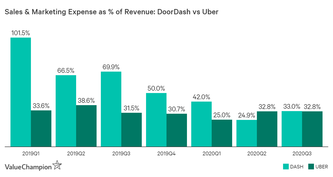 Sales & Marketing Expense as % of Revenue : DoorDash vs Uber
