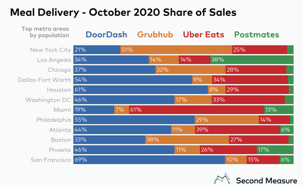 그럽허브(GrubHub), 우버이츠(Uber Eats), 포스트메이트(Postmates)들이 도시 시장에서 시장 점유율을 놓고 치열한 경쟁을 벌이고 있는 동안, 도어대시(DoorDash)는 단순히 경쟁자들이 별로 관심을 기울이지 않던 지역에 더 넓은 네트웍을 부여했다. 그리고 COVID-19 대유행은 소비자와 그들의 지갑이 도시에서 교외로 이동함에 따라 시장 점유율을 더욱 높였다. 뉴욕과 같은 시장에 훨씬 더 많이 노출되었던 그럽허브(GrubHub)나 우버이츠(Uber Eats) 같은 경쟁자들은 이러한 변화로 인해 어려움을 겪었다.