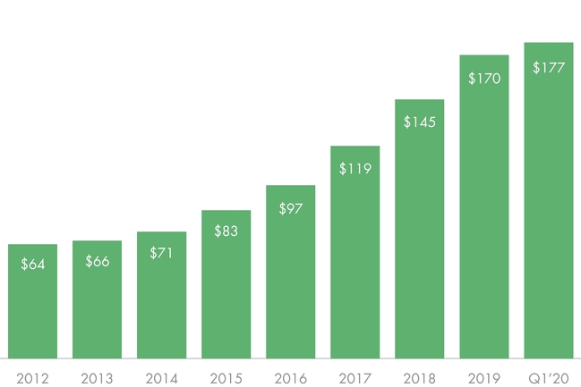 흥미롭게도 우리 사업은 역사적으로 강력한 코호트 수익 일관성의 혜택을 받았습니다. 우리의 성장과 비즈니스의 기본 역학을 추적하기 위해 우리는 연간 구매자 집단의 행동을 면밀히 모니터링하고 분석합니다. 우리는 플랫폼에서 구매자가 처음 구매 한 연도를 기준으로 연간 구매자 집단을 정의합니다. 역사적으로 우리는 연간 구매자 집단에서 일관성을 관찰했습니다. 아래 그림에서 볼 수 있듯이 각 코호트의 총 지출은 첫해 이후 안정화되고 향후 몇 년간 일관된 수익 흐름에 계속 기여합니다. 코호트의 일관된 행동은 우선 구매자의 반복적 인 지출과 구매자 기반의 전체 규모에 의해 주도되며, 이는 개별 구매자 행동의 변동을 정상화합니다.
