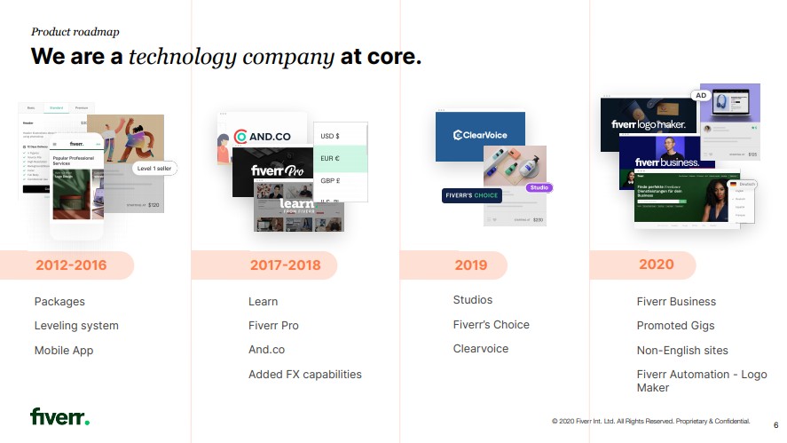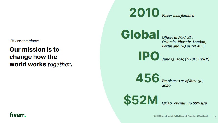 파이버 주가는 현재 206달러 수준이며, 2020년 올해만 678 % 상승했다. 연초 30달러 수준이였으니 놀랄만한 성장이다. 2010년 설립된 기업으로 IPO는 프리랜서와 일한 경험을 바탕으로 프로세스가 얼마나 어려운지 직접경험한뒤, 이를 해결하기 위해 Service-as-a-Product ( "SaaP") 모델을 개척하였다. 주문형 전자상거래와 같은 경험으로 프리랜서가 아마존에서 물건을 사는것 만큼 쉽게 개발했다고 한다.