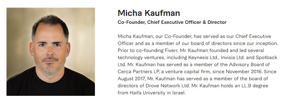 코로나19가 우리에게 다가온뒤 전세계는 많은 변화를 겪고 있다. 그중 비대면관련 수요는 급격하게 커졌다. 미국에 상장한 인테넷 리테일 기업중 Fiverr에 대해서 알아보자. CEO는 Micha Kaufman. Israel 쪽 사람이다.
