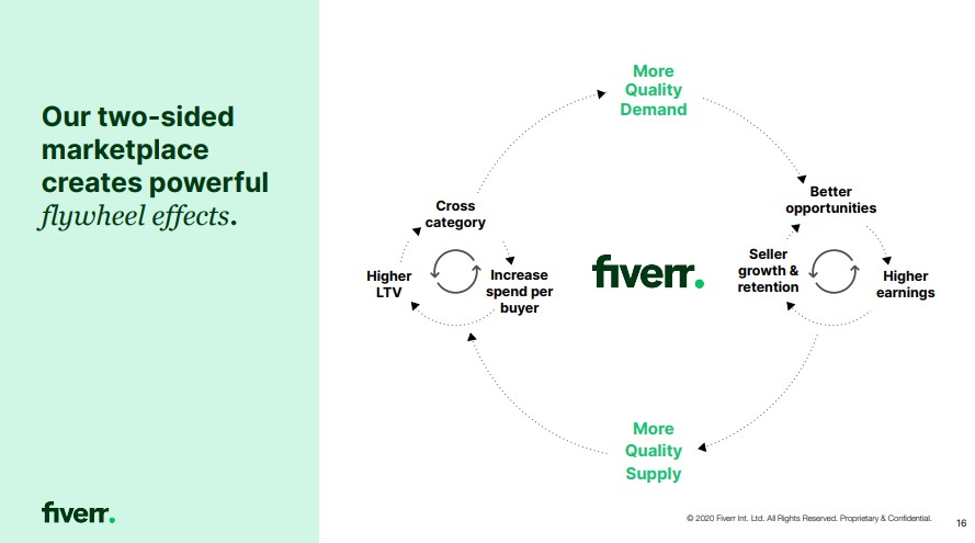 Fiverr의 flywheel effects는 buyer와 freelancer의 중간위치에서 작동하는 플랫폼 즉, 마켓플레이스의 변화를 의미한다.