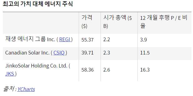 최고의 가치, 가장 빠른 수익 성장, 가장 모멘텀을 가진 상위 3 대 대체 에너지 주식이 있습니다.