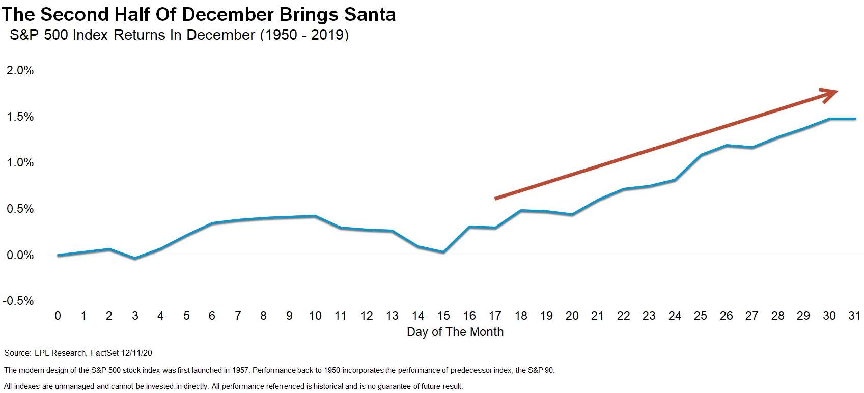 주식의 경우, 달력은 우리가 일년 중 산타클로스 랠리 기간이 가까워지고 있음을 알려준다. 보통 12월은 주식으로선 연중 가장 좋은 달 중 하나지만 LPL파이낸셜의 라이언 데트릭이 상기하듯 선물들이 들어오는 달의 후반기다. 이번에는 역사가 맞는지 지켜보도록 하겠다.