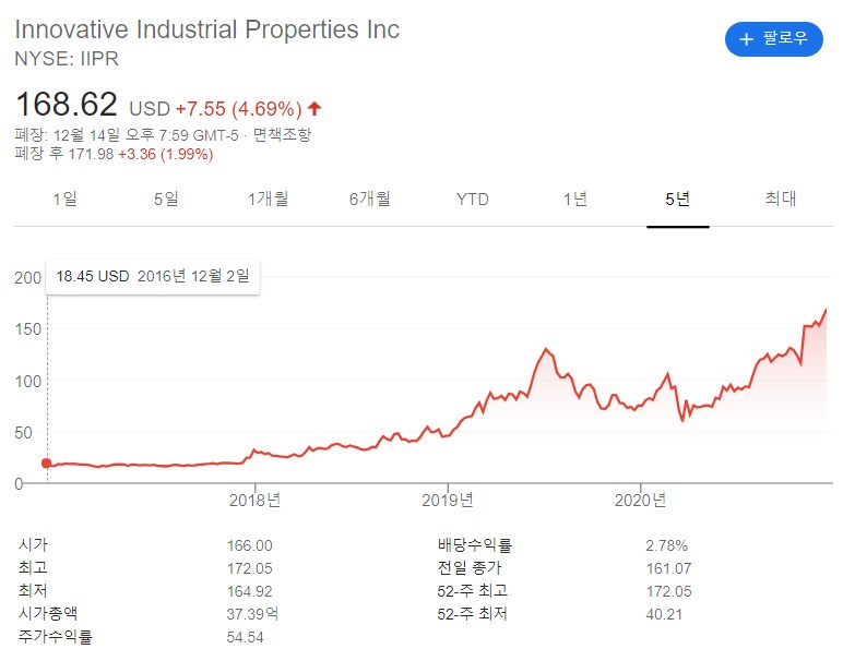 마리화나 중심의 부동산 투자 신탁 ( REIT ) Innovative Industrial Properties ( NYSE : IIPR ) 는 13F 파일러의 총 소유권이 2 % 증가했습니다 (약 360,000 주). ) 3 분기에 BlackRock은 지분을 573,754 주 늘린 350 만 주를 기록했습니다. Jim Simons의 Renaissance Technologies도 72,000 주 포지션을 시작했습니다.