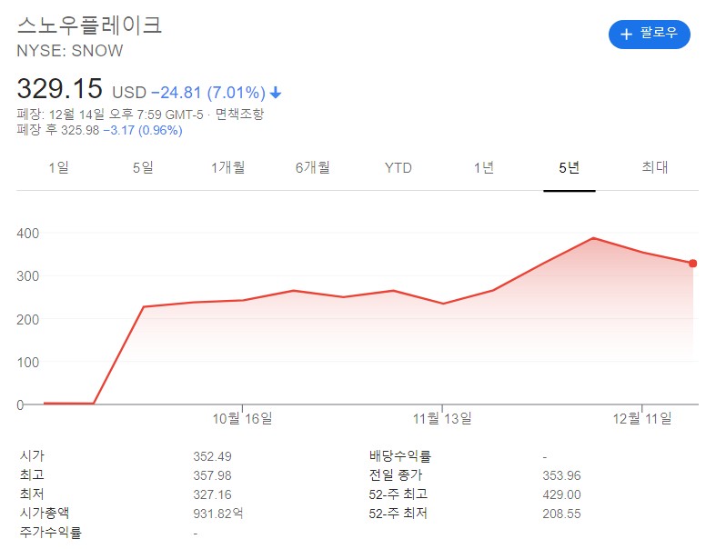 IPO이후 공개된 주식은 상승탄력이 붙지만 해당주식은 락업이후를 잘 살펴봐야 합니다. Snowflake(SNOW) 락업 기간은 21년 3월 15일 월요일로 만료됩니다. 스노플레이크는 지난 9월 16일 공모에서 2억8,000만주를 발행했었다. 공모 규모는 초기 주가(120.00달러) 기준으로 336억 달러였습니다. 스노우플레이크 폐쇄 기간이 종료되면 대주주와 회사 내부자의 회사 지분 매각을 막는 규제가 풀리게 됩니다.