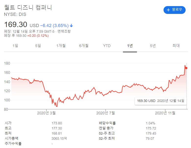 디즈니(DIS) 디즈니(DIS)가 코로나19 발생당시 $85 부근을 터치했다. 이후 106%의 놀라운 상승을 보여주었다. 최근 뉴스에 따르면 월트디즈니의 온라인동영상서비스(OTT) 디즈니 플러스가 내년 한국