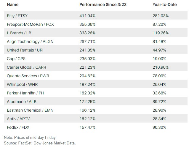 한편, 다우존스 마켓 데이터에서 가장 주목할만한 주식을 12월 11일 공개했는데 이는 디즈니의 다우존스 마켓데이터는 어떤 종목들이 가장 주목할 만한 반등을 이끌어냈는지 알아보기 위해 3월 23일부터 12월 11일 정오까지 최소 157%의 상승률을 보인 S&P 500 지수 회사들을 선별했다. 우리는 또한 그러한 점프가 상대적인 것에 불과하다는 점을 감안하여 지금까지도 하락하지 않았던 주식들을 걸러냈다.