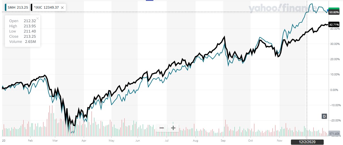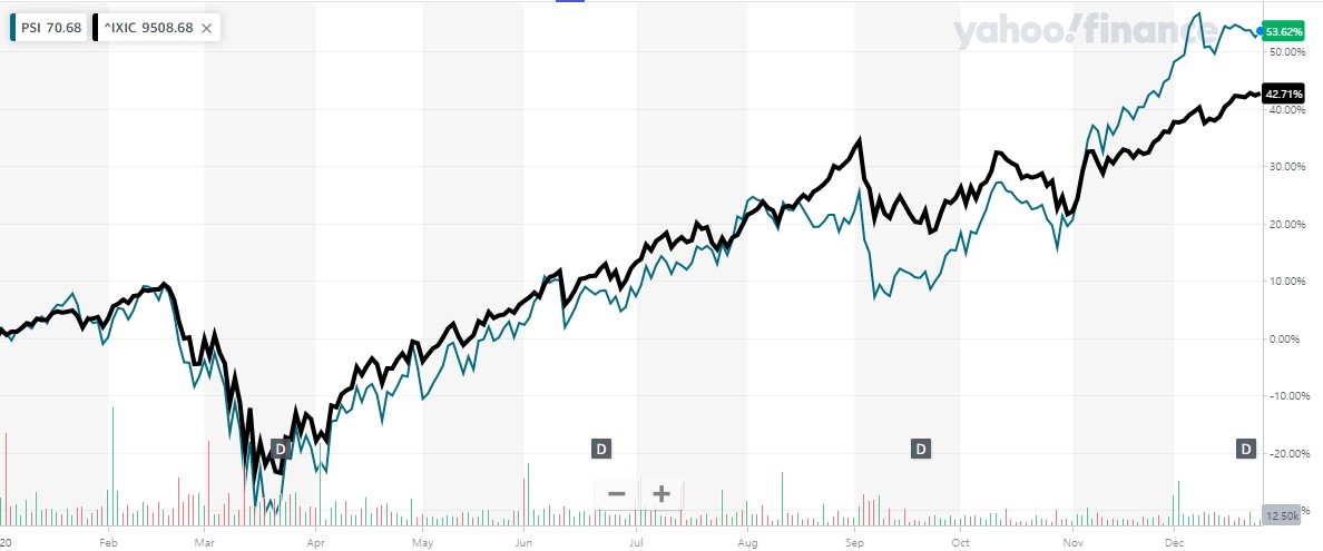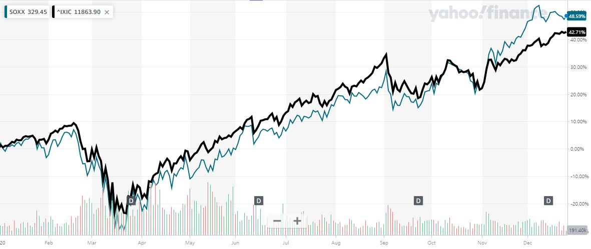 기술섹터는 2020년 최고의 퍼포먼스를 보여준 해다. 반도체주식은 올해 50%이상 수익을 올린 섹터이다. 반도체는 2020년에 경제적으로 회복력있는 섹터임을 입증한 셈이다. 코로나 판데믹에도 불구하고 반도체의 매출은 5%이상 증가했다.반도체 관련 업계에서는 내년 전망은 8% 증가할것으로 내다봤다.