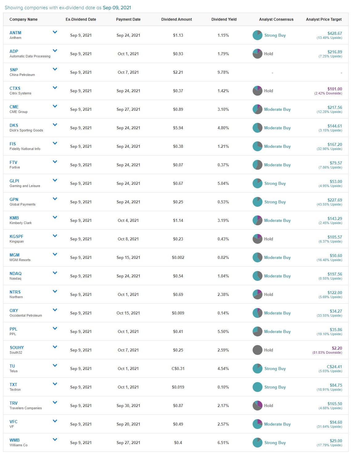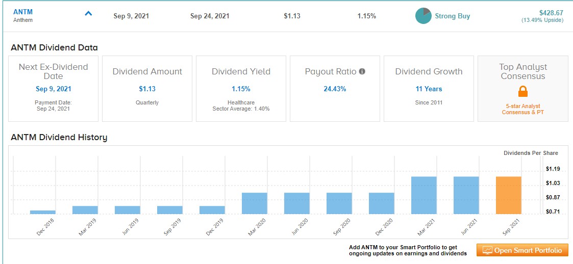 Anthem Inc(ANTM)은 배당지급일이 9월 24일 입니다. 배당금은 $1.13, 배당율은 1.15%, 애널리스트 TP가는 $428.67을 제시하네요.