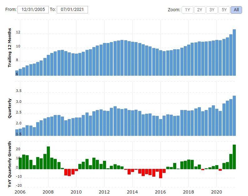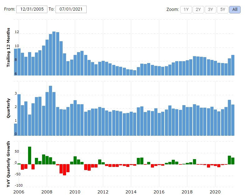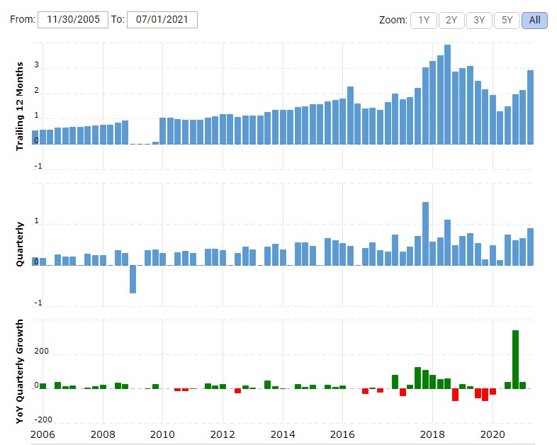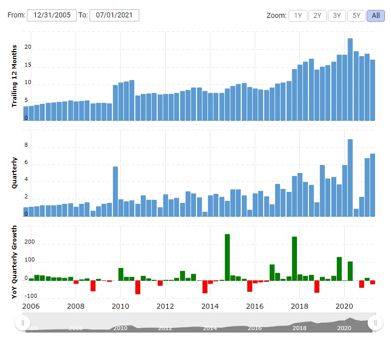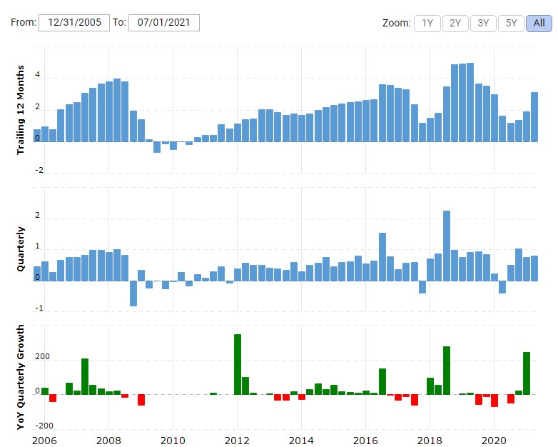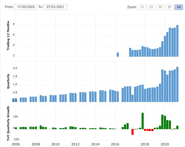 배당이력은 점진적으로 우상향했음을 알수있습니다. 배당성장은 2011년 이래로 11년이 되었습니다. ANTM의 매출역시 점진적으로 우상향 하고 있습니다.