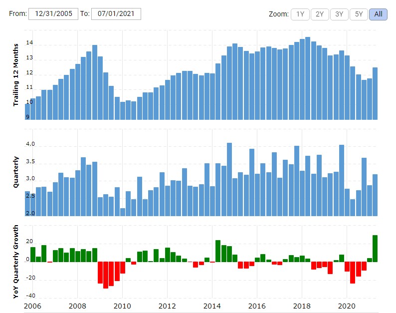 Textron Inc(TXT)의 매출은 전세계를 대상으로 한다지만 조금 들쑥 날쑥 하지만 매출은 성장을 시도하는 모습입니다.
