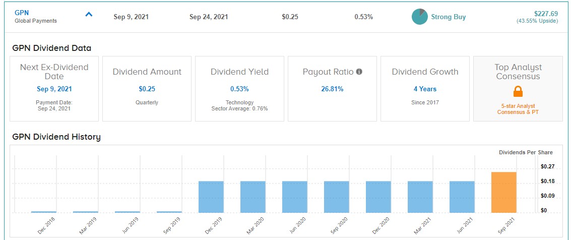 Global Payments Inc(GPN)는 $0.25달러를 배당하며 배당율은 0.53% 애널리스트 목표가 $227.69를 제시하네요.