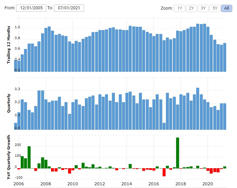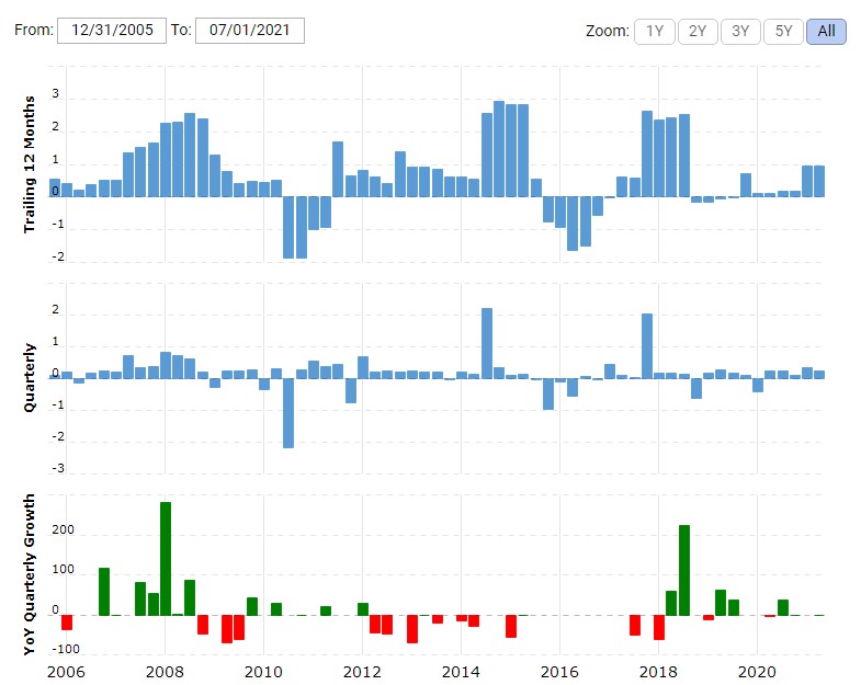 Textron Inc(TXT)의 EPS 역시 매출과 동조화 되는 모습을 보여주고 있습니다.