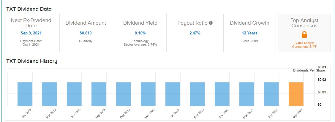 Textron Inc(TXT)는 항공기, 방위, 산업 및 금융 사업에 종사하는 다중 산업 회사로 전 세계 고객에게 제품과 서비스를 제공합니다. 배당율은 0.10%, 배당금은 $0.019 12년 연속 배당을 했습니다.